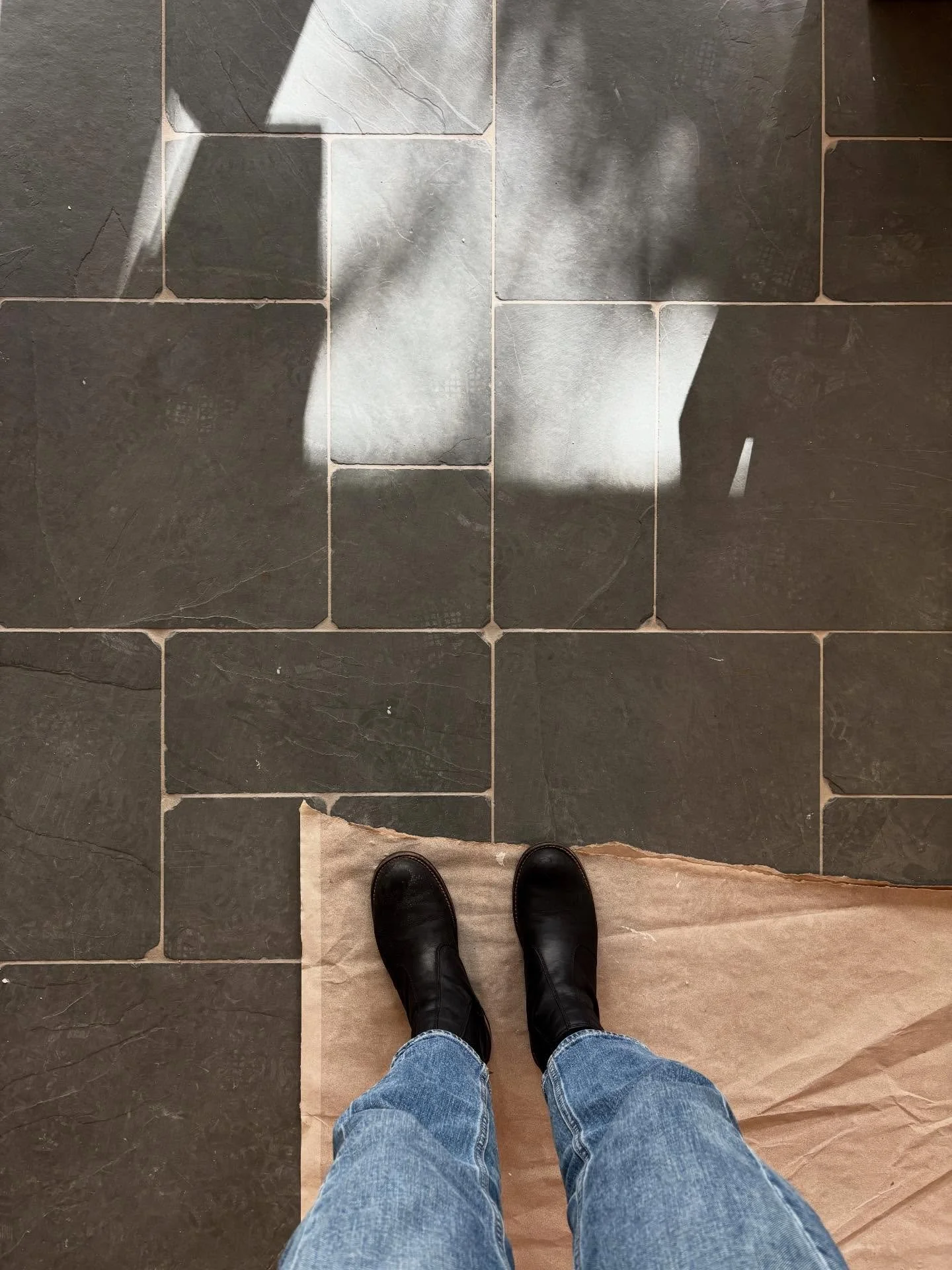 View fullsize Details, details! This tumbled, Montauk Blue slate tile needed its own unique layout for a lived-in look that gives “it’s been here forever.” The unique mix of natural stone tile sizes allowed us to really have fun coming up with a